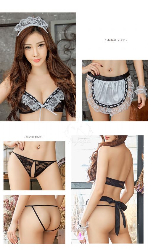 此款性感女僕角色扮演服六件組, 上半身採用情趣比基尼繞頸造型設計, 魅黑色緹花網紗綴以層層白色蕾絲, 深V式領口造型更顯誘人~ 下半身火辣性感的黑色蕾絲開襠褲, 再繫上純潔可人的白色小圍裙, 搭配白色蕾絲髮飾和手飾, 化身成極致性感女僕擄獲他的心!