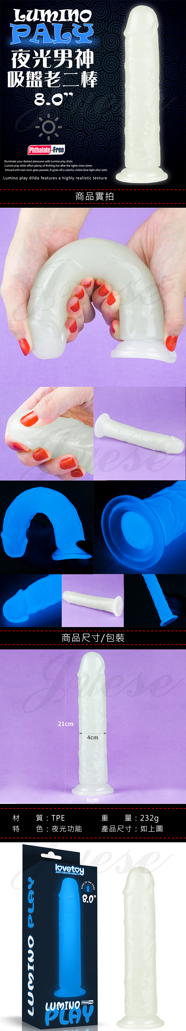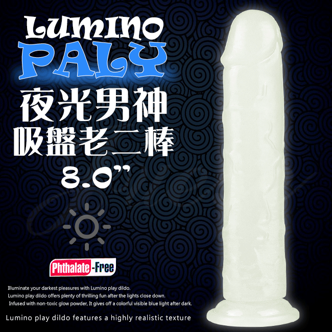 首頁 > 女用狂High專區 > 無電動逼真陽具 > Lumino 夜光男神吸盤矽膠按摩棒-8吋(特)
