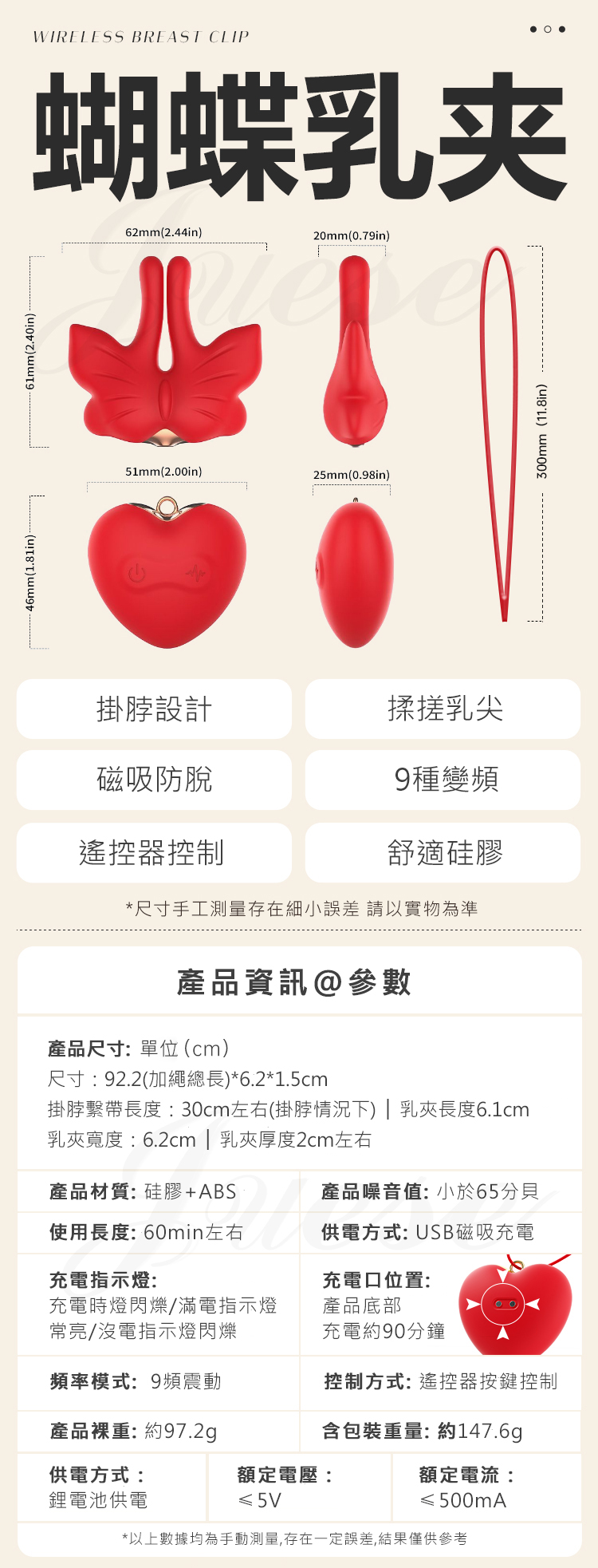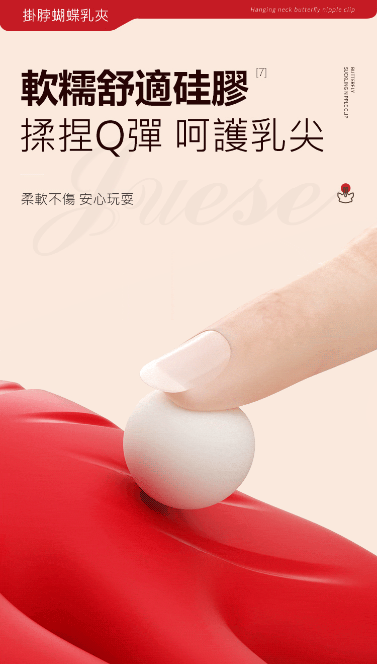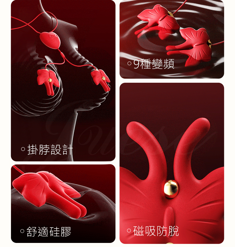掛脖造型設計,狂甩不掉穩穩夾震,不限胸型花式玩法,模擬揉搓乳尖,彷彿指尖高頻撩撥。