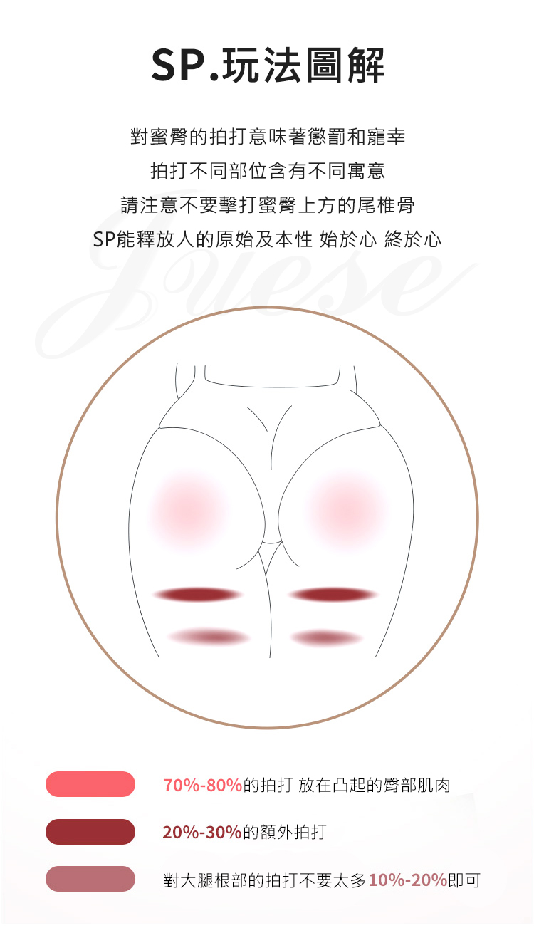 對蜜臀的拍打意味著懲罰和寵幸,拍打不同部位含有不同寓意,請注意不要擊打蜜臀上方的尾椎骨,SP能釋放人的原始及本性。
