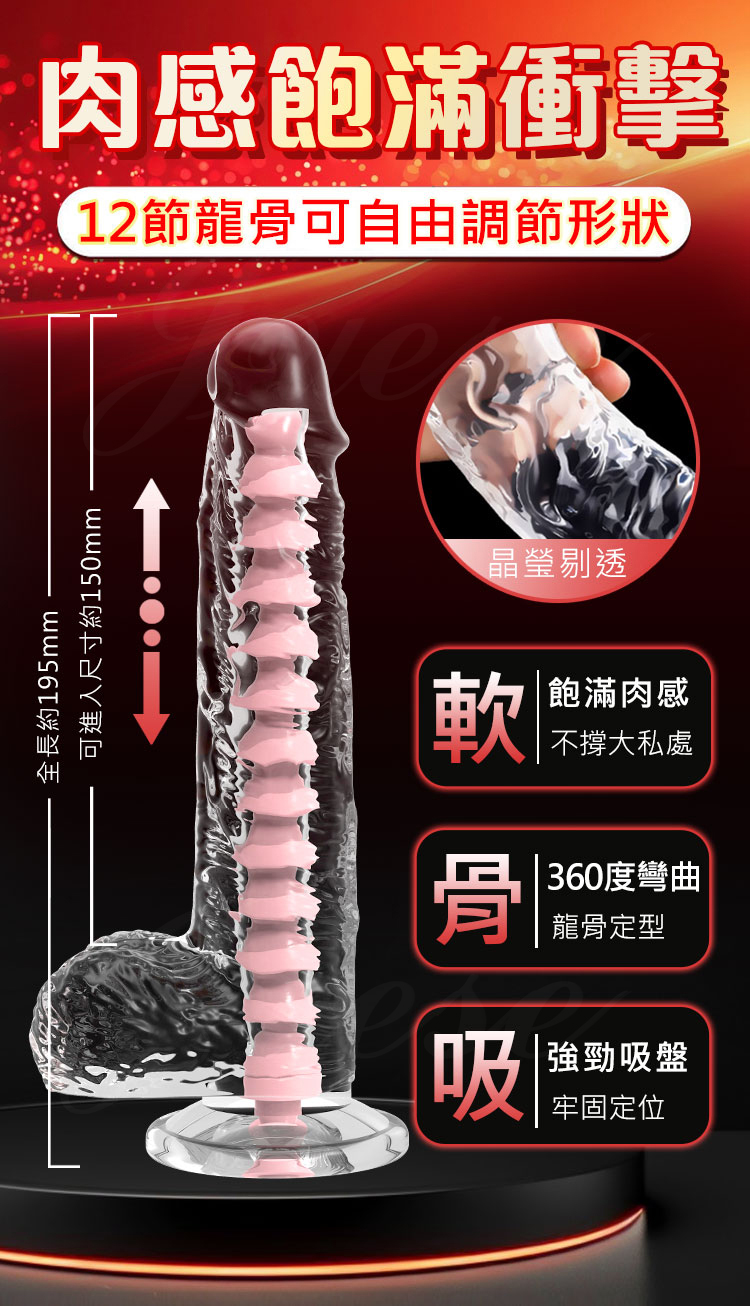 龍骨任意塑造形態、想彎曲想360度旋轉角度都可以。粗大凸起青筋,強力大吸盤,可強力吸附在光滑表面。