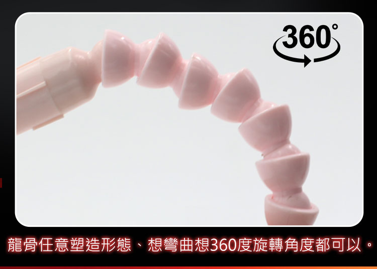 萬向龍骨由每顆堅實的骨節組合而成,可依喜好或姿勢自由調整形狀。角度任意彎曲,可調式你任意想到的位置。