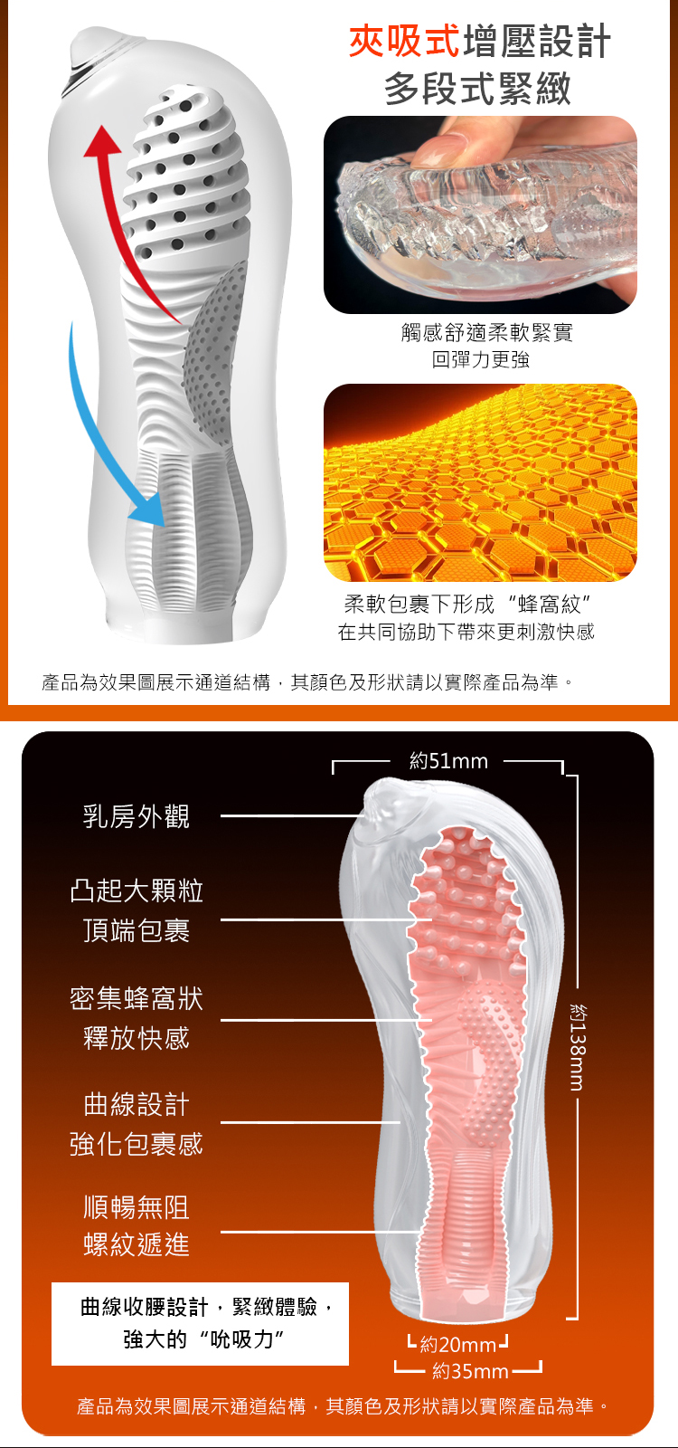 立體通道刺激,特有的螺旋狀結構可排出內部多餘空氣運用,空氣動力學實現激爽的吮吸快感。