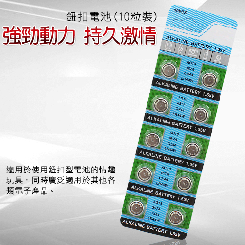 本品為不可充電AG13(或稱LR44)鈕扣電池。適用於站上使用鈕扣電池的按摩棒,震動蛋等各類情趣玩具。電力強勁,恒定釋放。保證充足的電力支持,再不用擔心因為中途電池沒電而驚擾了興致!享受更舒心暢爽的激情之旅!